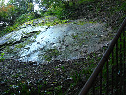 ![]() ![]() ![]() 先へ進むと山道となる。コースが2通りあり周回できるようだ。山道と言ってもコンクリート製の丸太を土止めにした階段がずっと設置されている。周囲は高い杉と谷筋を通るため、午後3時半なのに薄暗い。途中には句碑、石像がいくつもあり、句碑の道(?)と書いてあったように思う。更に行った先に「国指定特別天然記念物」の鏡岩が現れる。案内板に1億年前に・・・云々と成り立ちが記されている。鏡岩まではほぼ一直線に登り、そこから左に折れると、すぐに尾根に出る。尾根は木が少なく、太陽がまだ当たっているので明るい。左手にやや広い平坦地があり、3メートル程の社が建っており、休憩場所と周囲には石仏が多い。