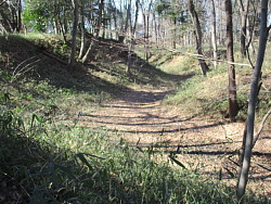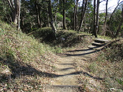 散策路は西ノ郭西で堀を越え、オオムラサキの森・活動センター側にでるが、後世の道になる。西の堀は天然の谷を利用したようで、今も水が流れている。大手門があった辺りは藪が濃く、ハッキリしないが土塁に凹みがあるのでその辺りだろう。