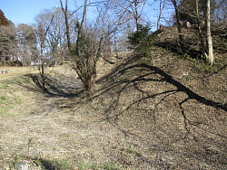 数十年振りの訪問。まずは駐車城脇の遺構から散策開始。伝搦口(からめて)跡・外の堀跡を見学する。広い外堀だがほぼ埋まっているのが残念。喰違虎口の土塁が大分削り取られているが、土塁は良好に残り高さもある。