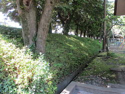 まず一周すべく北に向かう。東門を過ぎた辺りの土塁の法面は、東門までの法面と南面では整備具合がやや違う。北門は通行止め、西堀を南へ向かえば西門があり、3/4周で敷地内へ。西門の内側土塁もよく遺る。