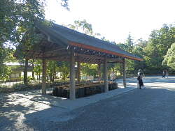 続いて土宮・下御井神社を参詣。土宮は外宮の鎮守の神(地主の神)を祀っていると記されている。下御井神社は板塀で囲われた中に小ぶりな社が建っている。帰りは神楽殿、九条殿の間を北御門口へ向かう。鳥居・御厩を過ぎ、火除橋を渡り駐車場に戻る。