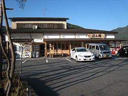 金毘羅山(572.7m)・翠黛山(577m)〜寂光院・三千院 平成22年(2010)12月5日(日)晴 参考地形図 大原 戸寺バス停で下車する。目の前がドレッシング専門店、志野の大原街道店がある。手持ちの案内図ではセブンイレブンとなっているが、2006年頃のものなので、最近に出来たらしい。民家の塀の案内板にもセブンイレブンで記されている。昼食をコンビニで用意しようと思っていたのだが、あてが外れてしまった。しかし餅・赤飯などを販売しており、トイレも借りられるので助かる。駐車場からはこれから歩く山並みがすっきり見える。