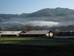 ![]() ![]() ![]() 敷地左の郵便ポスト脇から歩き始める。幾分くだり気味に進むと高野川の橋を渡る。周囲は畑で細い道路が通っている。京都一周トレイルの案内に沿って行けば、徐々に山側に進んで行く。東に目を移せば何の煙か分からないが、山の中腹に長くたなびき、大袈裟に言えば日本の原風景を見ているようでほっとする。左手の江文神社の鳥居を過ぎると江文峠からの道に出る。直進すればそのまま神社の参道で、周囲は杉などが多い。峠に向かう道を過ぎれば、正面に鳥居、奥に社が見える。鬱蒼とした杉木立に囲まれている。大きくはないが本殿などは、何ともいえない雰囲気の建物だ。