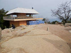 目に飛び込んでくるのは北端の弥山展望台で、工事中で行くことは出来ない。確か看板表示は今日まで工事と記されていたようだ。360度の展望と案内書に載っているが、潜り抜けてきた側に巨石は多く、岩に登れば望めるかも知れない。しかしほぼ360度と言える展望はすばらしい。晴れていれば尚よかったのだが。獅子岩駅から30分で山頂に来られるだけに、老若男女が居り、中にはスーツ姿が数人見受けられる。