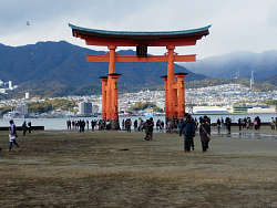帰路では厳島神社前の潮はさらに引いて、大鳥居まで歩いて行ける。観たかったのは満潮時の鳥居・建物群だったが、自然相手では仕方がない。折角なので浜に降りて鳥居に触れてみた。下から見上げると、その大きさに圧倒される。