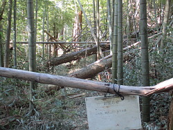 堀を下がって見上げると如何にも虎口と思わせる。ここに「おおじの森」指定標識が立ち、樹種スギ・ヒノキ・クヌギ他、面積2.6ヘクタールと記されている。更に下れば急坂になり続いている。戻り西へ行くと南が開ける。