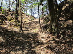 石段から振り返れば東屋が建つ郭の雰囲気が掴める。石段を上がれば主郭下の郭で、東屋・朱色の鳥居(神社名確認せず)・説明と縄張図がある。前方には主郭の法面が大きく見える。下の郭を左に行くと、数m上に上れ、帯郭?が見られる。先は主郭の西下の堀切底になり、右手に上がれば山頂(主郭)になる。