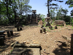 主郭下の郭、朱色鳥居の左に石段があり、上に出れば両崖山山頂で正面に御嶽神社が祀られている。神社右奥から北尾根に下れば目立つ堀切が二本あり、これも土橋・堀切ではと思える地形がある。先は物見台があっても不思議ではない場所がある。西尾根にも郭、堀切が書かれていたが、時間が無く手前駐車場に戻る。