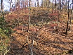 神社参道には行かず奥の沢に向かう。小さな池、先には片倉沢と湧水が多いようだ。見上げる斜面は天然の谷(沢)でほどよく分断されている。市街地も眺められ、意外に標高が高いことに驚く。奥の沢は片倉沢より遙かに大きく、天然の竪堀になっている。奥の沢辺りはモミジが多いが、紅葉は終わりだった。