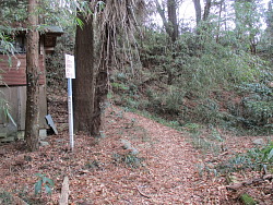 反対側に城跡入口の標識があり、そこを左に入る。道は切り通し状で堀底を進む感がある。本来の城道ではないだろう。道が左に大きく曲がり、斜面を登り始める手前に作業小屋が建っている。左右に堀を思わせる凹みがあり、小屋手前には土塁?、やや進んだ上からは土塁背後に狭い平坦地が見える。小屋の後ろ辺りは虎口と図に乗っている。