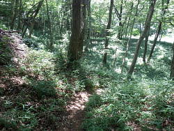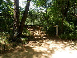 北条氏照が八王子城へ移る前の城で、自然地形を活かした平山城の遺構が良く保存されている。八王子駅北口から滝山城址下バス停まで行く。案内ではここからの道が大手口で、この坂は天野坂と載っている。民家が終われば散策路らしくなり、木立が鬱蒼としてくる。