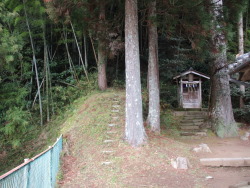 帯郭を西に行くと、緩やかな下りとなり幾段かに整地されており、開けた場所からは近くに民家が見える。二の郭を西下にも帯郭があるが整備されず、踏み込みを躊躇する。行けば城門跡など見られたかも知れない。後の改変かは不明だが、堀切のような所がある。