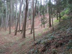 二の郭内は杉・檜林となり暗く、下草は多くはないが歩きづらい。一部下を覗けるが、西から南の斜面側は郭内より鬱蒼とし一部で僅かに法面が見える程度。東端は下に主郭境の堀がよく分かる。幾つかの堀があるだろうが、全体に土塁を含め見当たらず、腰郭・帯郭など高低差で防御していたのか。