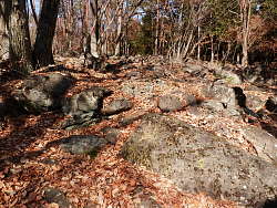 周囲の葉が落ち明るい尾根歩きが出来る。殆ど岩の無い場所から岩が目立つ場所と変わる。緩く登れば広い山頂に出る。山頂手前に[大堺]と彫られた石が出てくる。何の堺を表すのか不明だが、資料によれば麓から中腹には多くの積石古墳があり、石が集中している所は古墳なのかも知れない。