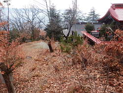 50分近く下れば右下に山神宮の赤茶色の屋根が見え出す。山神宮横に下り立てば、赤茶色の屋根は本殿、その前に拝殿が建っている。拝殿の前は幅が狭く、2メートル程度に思えた。拝殿の前には石段が南に下っている。石段を下り国道140号線に出ても良かったが、北の遊歩道に進み、往路で通過した分岐点に出る。