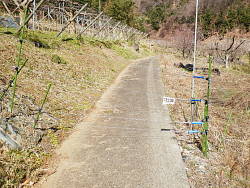 簡易舗装された道が延びており、左右のぶどう畑にはイノシシ除けの電気柵が設置されている。道も電気柵で塞いであり、初めは勝手に進入してはと、他の道を検討するが思いつかない。柵の手前に立て看板があり、戻って読み返すと、{進入する人はグリップを持ち、外して・・・戻してください}とあった。進入させてもらい奥へ。舗装が終わる辺りは右下のコンクリートが崩れている場所がある。