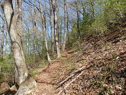 尾根を右へ行くと、明るい自然林から植林地に変わる。下にもあったヤマブキが遠くからでも目立つ。直ぐに[これより急坂 要注意]と標識があり、急な斜面が始まる。短いジグザグを繰り返しながら標高をあげる。途中で[急坂登山道・新登山道]の標識があり、新登山道はよく寺社で見かける男坂・女坂の違いかと思ったが、横の急坂登山道を見た限りでは、少々抉れて荒れた直線を回避するためのようだ。