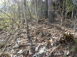 しばらくして朝日小沢・諏訪神社の分岐に着く。朝日小沢へは右後ろに下る道があるが、見る限りあまり歩かれていないようだ。馬立山へは尾根を外れ左に下る。地図にガレ場と記載がある通り、急斜面をトラバースするように付けられた道で、右下は深く落ち込んでいる。狭い上に落葉、倒木など通行には注意を要する。一部に虎ロープが張られている。