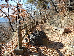 ほぼ直線の道が緩やかに登れば、正面に東屋が見え、第一休憩所へ着く。ここで左に折れる。先には左の急斜面対策で手摺りが付けられている。