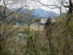 巻き道が南に向かうようになると、土留め兼用の階段が現れる。正確ではないが北東から南西に向かって登っている。登った先で鋭角に曲がり、東に向かって緩やかに登る。江戸時代より前に烽火台があったようで、幾段かの小さな平地が見られるが、遺構なのかどうか。山頂は南側が開け眺めが良い。中央に四等三角点、数本の山桜が咲いている。