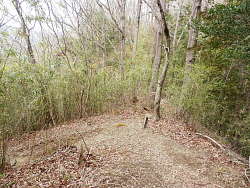 山頂を東へ数メートル下り登り返せば、100メートルほどでアンテナの建っている東端に出る。下った場所は堀切なのか自然地形なのか不明。ヤマツツジには早く蕾だった。