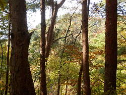 先にも所々石組みが見られるが、当時のままかは分からない。甲府市自然休養林と銘を打っているだけあり、赤松と落葉樹が多くを占めていて、明るい山である。山は程よく色づいている。登るにつれて竪堀跡、土塁跡、最初の門跡などが現れる。堀跡は草木が多く、分かりづらい。